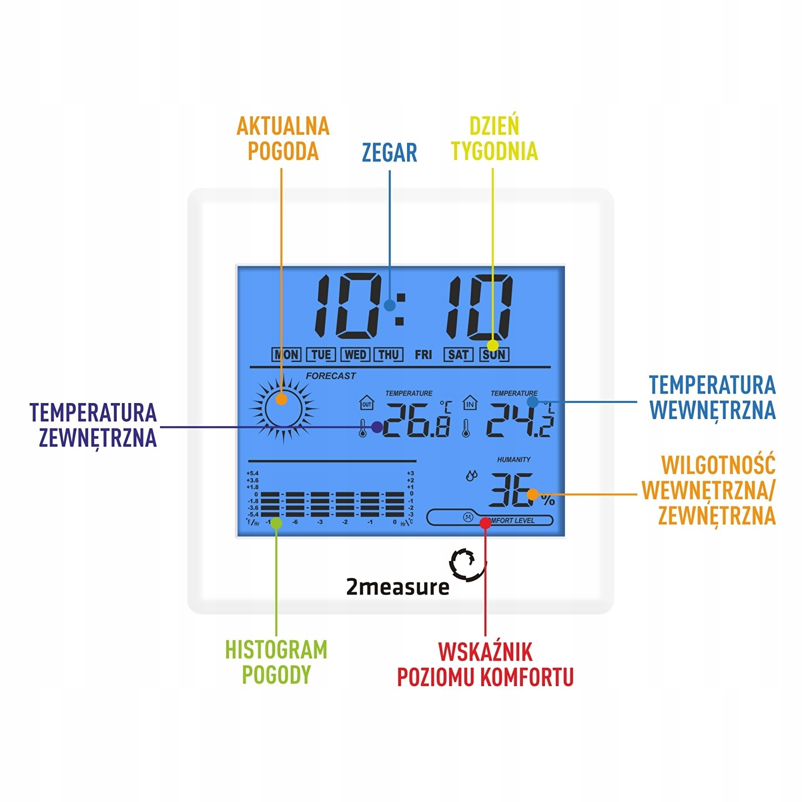 Белая, элегантная электронная метеостанция с гигрометром, термометром и зондом позволит вам собирать и контролировать измерения температуры и влажности воздуха как в помещении, так и на улице! Берегите свое здоровье и здоровье своих близких. Благодаря четкому дисплею с синей подсветкой вы можете быстро и легко узнать текущую температуру и влажность, а также время, дату и день недели. Встроенный графический прогноз погоды проинформирует вас об изменениях погоды. График изменения температуры за 12 часов визуализирует изменения, происходящие в вашем окружении. Индикатор комфорта покажет, не слишком ли сухо или слишком влажно место, в котором вы находитесь! Благодаря встроенной памяти вы также сможете проверить последние минуты. и макс. значения, зафиксированные во время измерения! Метеостанция – отличная идея для подарка! Его белый корпус и классический дисплей, а также возможность подвешивания или стояния идеально вписываются в любой дизайн интерьера! Дополнительным преимуществом устройства является возможность установки будильника – поэтому метеостанция, размещенная на прикроватной тумбочке, может выполнять еще и функцию будильника!
