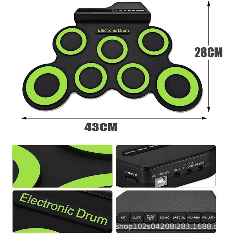 ✔ предоставленные на 7 силиконовых перкуссионных прокладках, включая объем/werbel/hi-hat/crash/ride/езда, генерирует идеальные звуки и моделирует реалистичную игру на игровых барабанах.
