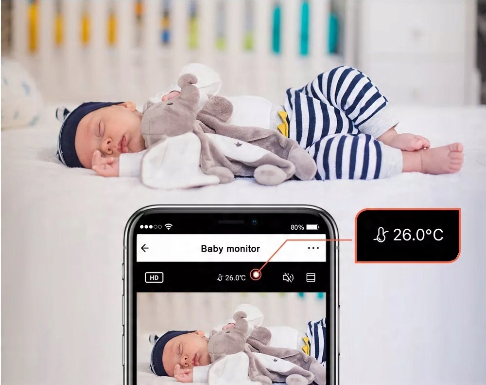 Устройство оснащено датчиком температуры, благодаря которому вы можете проверить температуру в помещении, где находится ваш ребенок, в приложении.