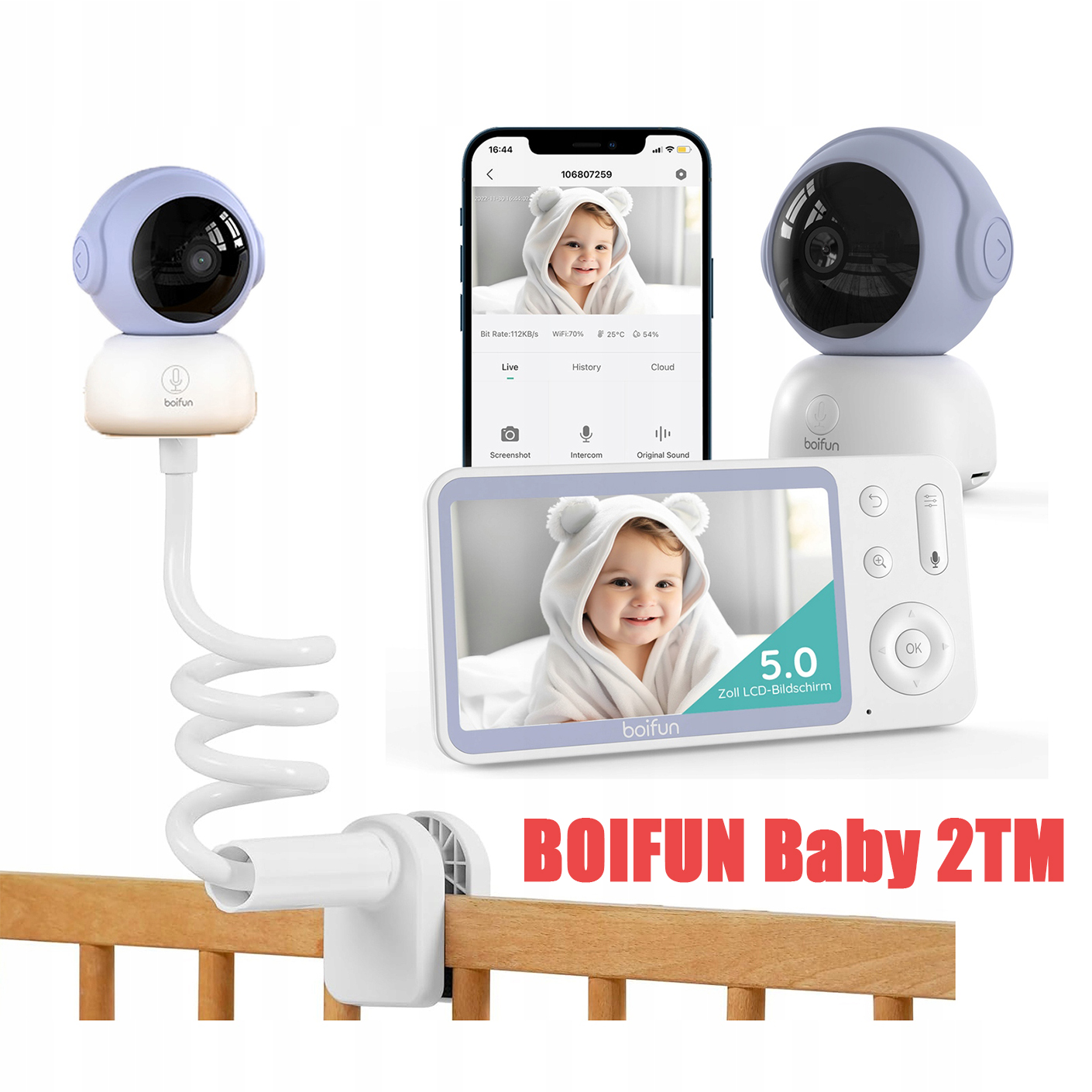 Камера-няня BOIFUN 2K 5 дюймов с приложением для телефона, вращение на 360°,