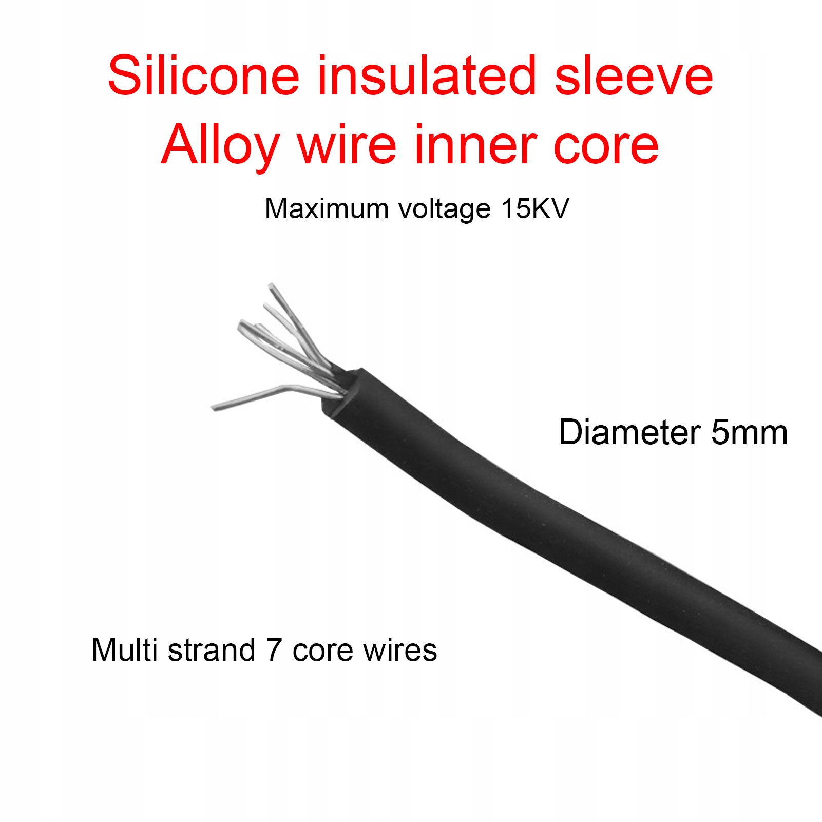 2. Стабильная производительность: силиконовый внутренний сердечник с изоляцией и проволока из сплава устойчивы к повреждениям, максимальное напряжение составляет 15 кВ, диаметр 5 мм, а 7-жильный многожильный провод обеспечивает надежное применение.