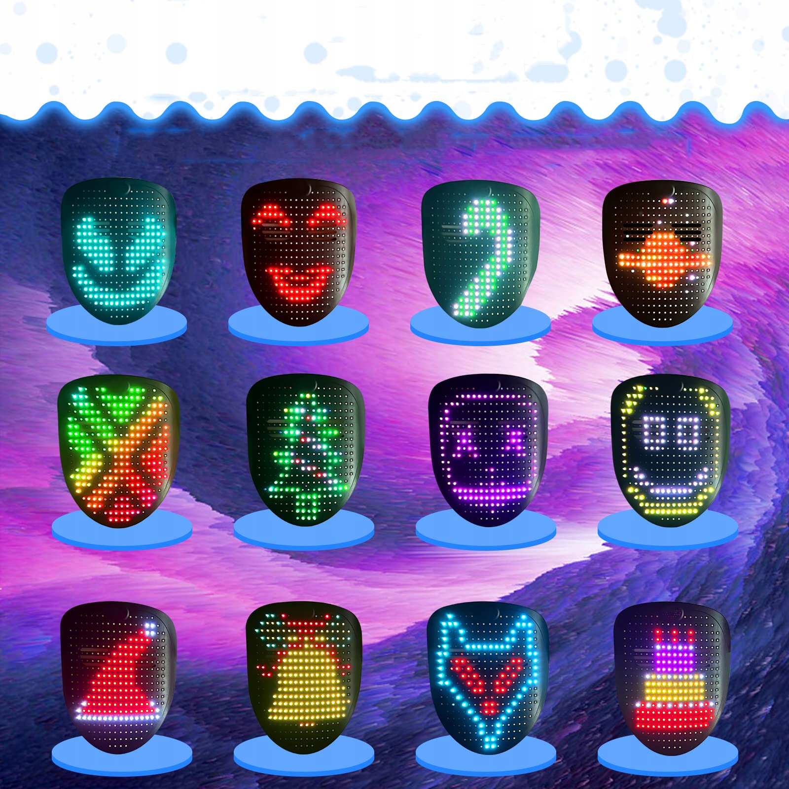 Наша светодиодная маска предлагает впечатляющий дисплей с 50 узорами, 25 режимами динамического отображения и 25 статическими изображениями, что позволяет вам легко переключаться между режимами динамического отображения в зависимости от вашего настроения и случая. Будь то день рождения, Хэллоуин, Рождество, рейв или фестиваль электронной музыки, эта светящаяся маска идеально подойдет для любого случая и сделает вас центром внимания.