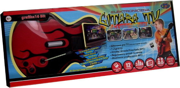 В комплект входит гитара, регулируемый ремень, ТВ-кабель, кабель для подключения MP3-плеера, евроразъем. адаптер и инструкция на польском языке. Гитара имеет 4 режима: аркадный, бесплатный, соло, mp3. Три многоуровневые программы.