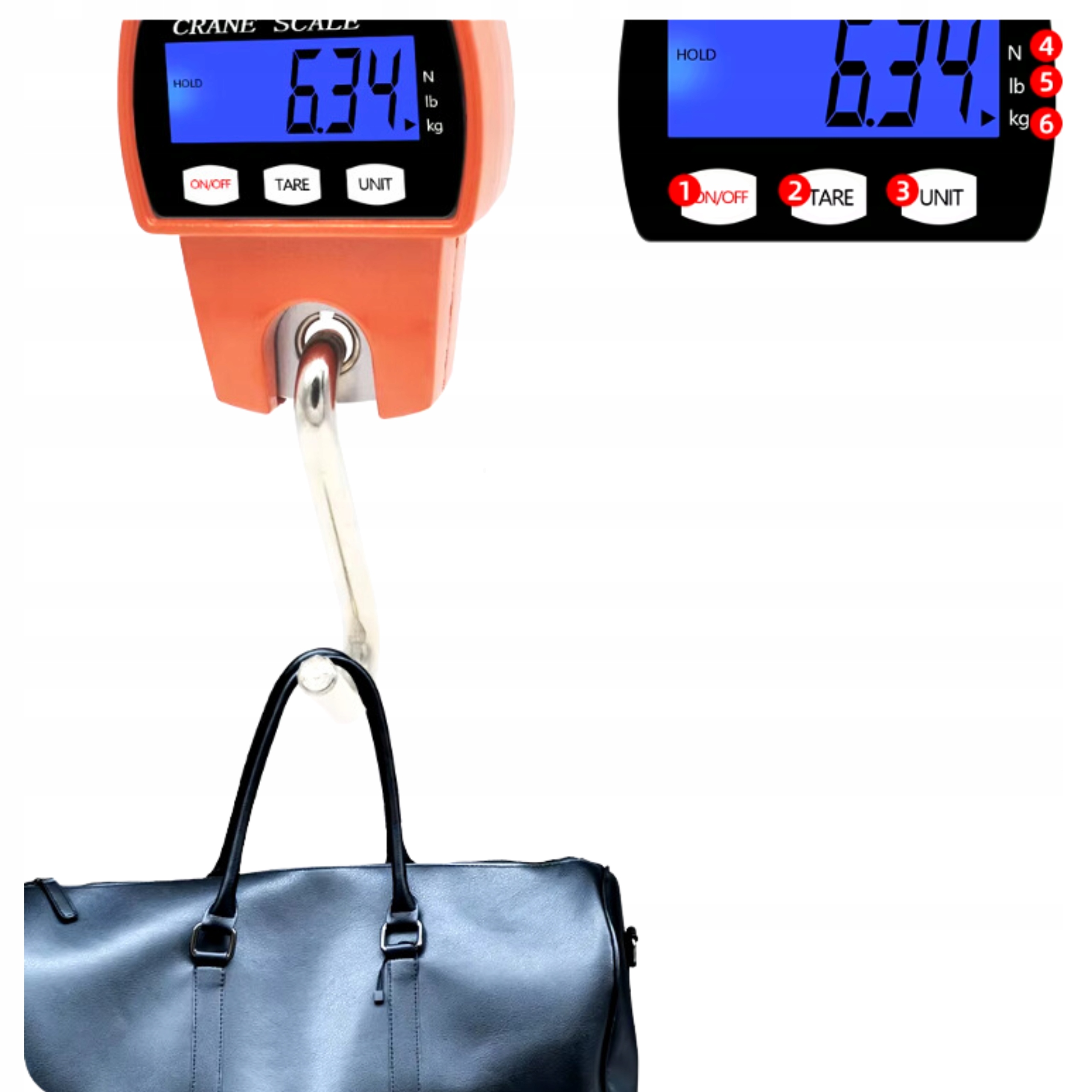 2⃣ Повесьте объект на крючке и дождитесь стабилизации индикации веса. (кг, lb, n) и прочитайте результат на освещенном дисплее.
