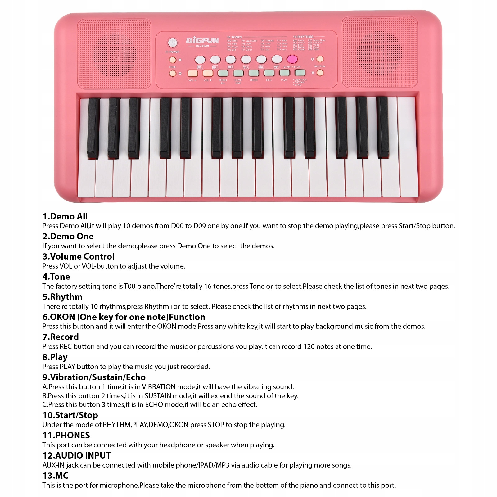 2. 【Универсальные функции】: Наше клавиатурное пианино предлагает широкий спектр функций, включая возможности аудиовхода и вывода, интерфейс питания Type-C, 16 тонов, 10 ритмов, 10 демонстрационных песен и такие функции, как запись, воспроизведение, вибрация, сустейн, эхо, запуск/стоп, наушники, звук и микрофон. Независимо от того, новичок вы или опытный геймер, в этой клавиатуре есть все, что вам нужно.