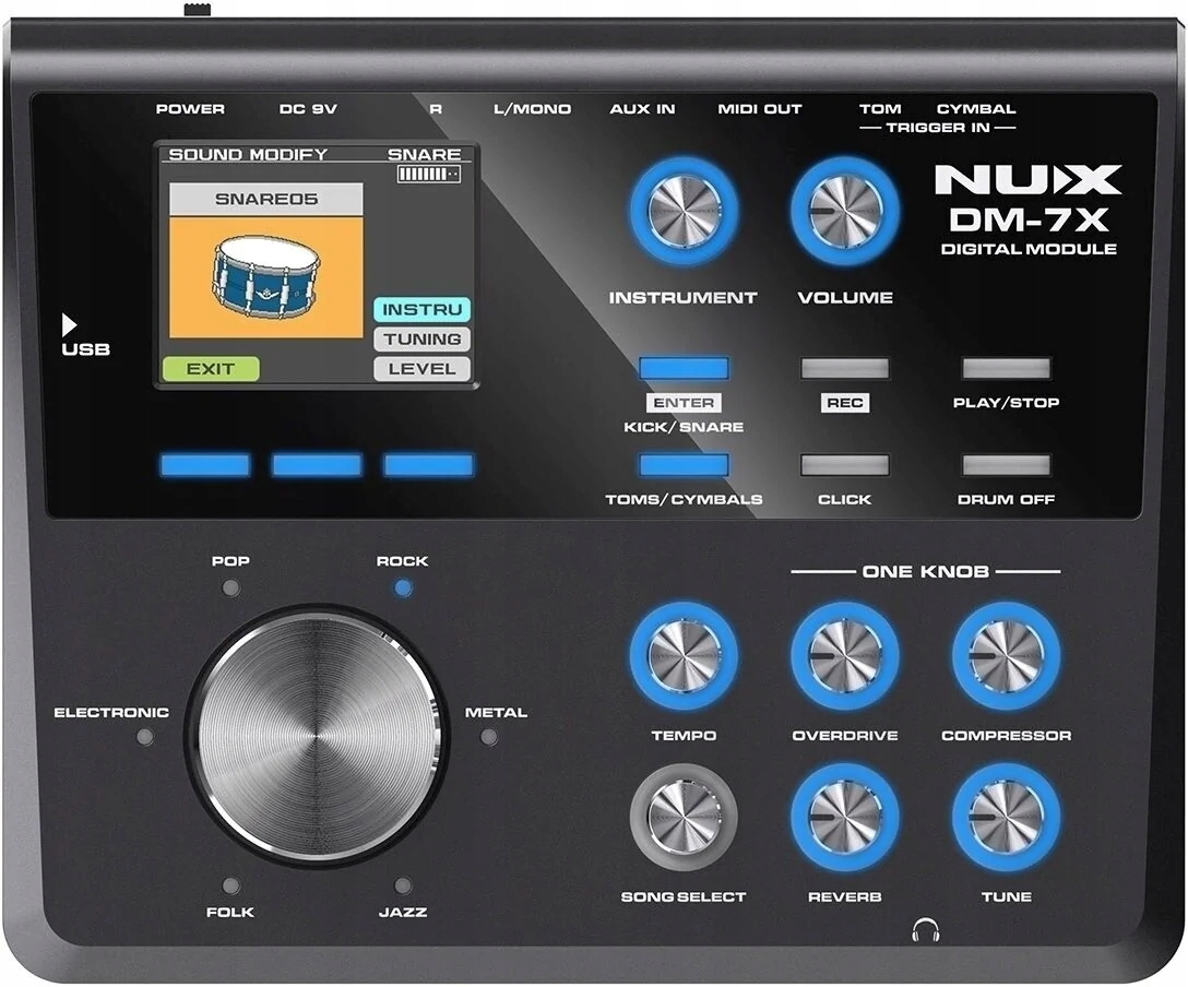 NUX DM-7X оснащен модулем с понятным и простым в использовании -использование и современный интерфейс. Инструмент позволяет редактировать готовые пресеты ударных, создавать свои собственные, записывать и одновременно тренироваться под минусовку.