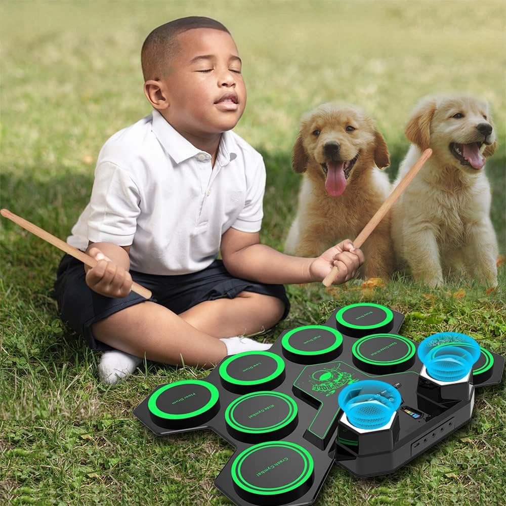 ROLLABLE PORTABLE DRUMS — это отличная складная ударная установка, которая наверняка понравится всем любителям барабанов. Игра на пэдах – отличное развлечение для опытных игроков и отличное развлечение для детей. Он развивает музыкальные страсти, учит координации движений и закладывает прочную ритмическую основу. Если вы задаетесь вопросом, какую ударную установку выбрать, чтобы начать свое приключение с барабанами, на эту модель определенно стоит обратить внимание.