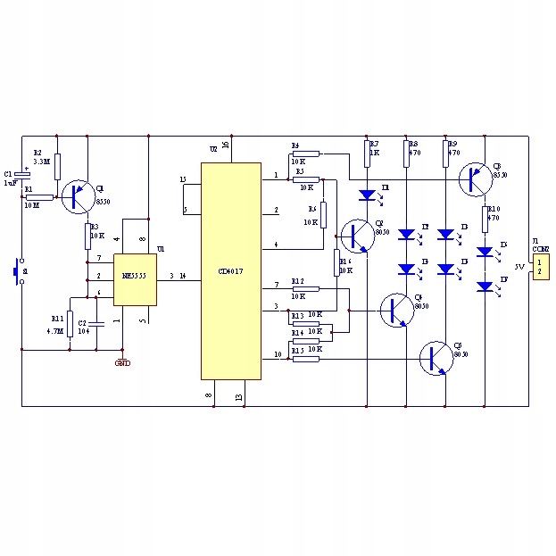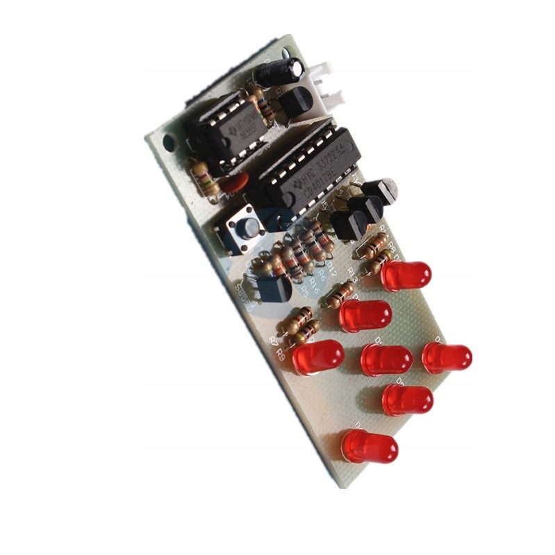 После включения питания 7 светодиодов будут случайным образом отображать количество очков, игроки нажимают переключатель S1, 7 все светодиоды загораются, только примерно через 7 секунд светодиод начнет мигать, и, наконец, случайное количество светодиодов загорится.