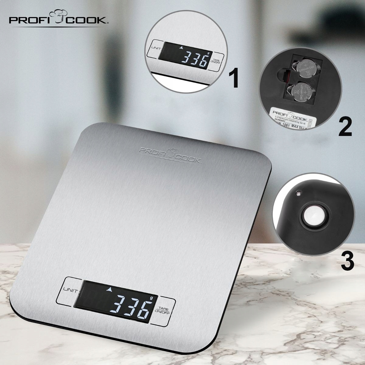 ProfiCook PC-KW — практичное устройство, которое всегда стоит иметь под рукой. Благодаря поверхности из нержавеющей стали оно вписывается в современный интерьер. Вы можете проверить вес, взглянув на читаемый ЖК-дисплей. Функция тары позволяет отсчитывать объем сосуда, в который помещены продукты питания, чтобы точно отмерить продукты внутри. Вы можете выбрать одну из трех единиц измерения веса — гр, кг, фунт. или унция