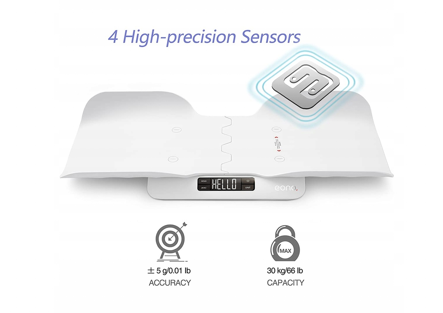 ТОЧНОСТЬ ИЗМЕРЕНИЙ: Вес ребенка Eono с 4 новыми точными датчиками весит до 30 кг (66 фунтов). Двигайтесь или нет, весы Eono за считанные секунды рассчитают точный вес вашего ребенка с помощью нашего запатентованного алгоритма определения.