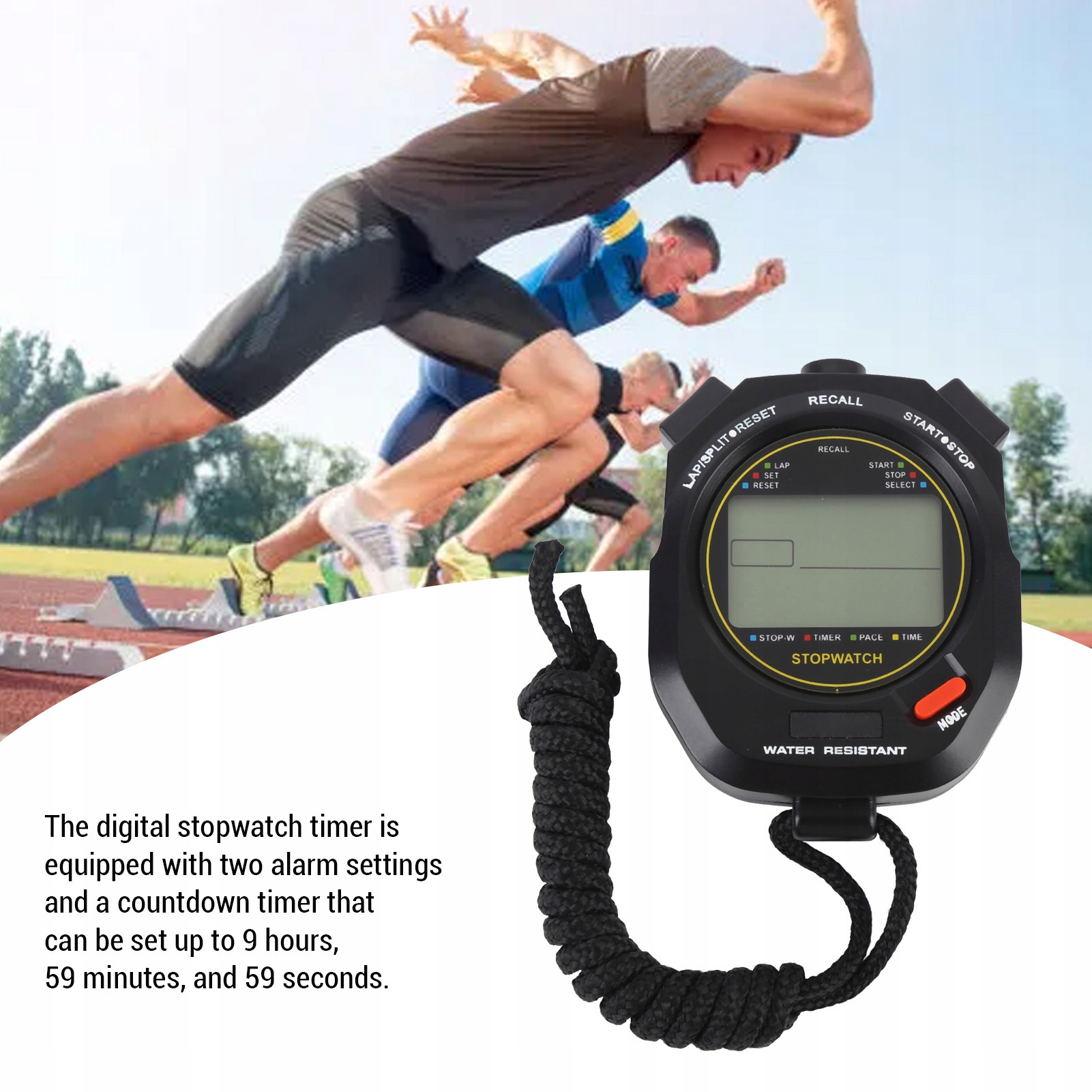 3. Отображение даты часа: электронный секундомер имеет дисплей часов и даты, с 12 или 24 -часовыми режимами для вашего удобства, что позволяет проверить время и календарь в любом месте и времени.