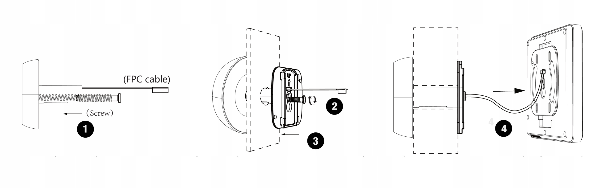 2️⃣ Вставьте глазок в отверстие глазка двери, убедившись, что сигнальный провод и винты торчат с другой стороны двери. Вставьте сигнальную ленту через верхнюю прорезь, а винты - через нижнюю прорезь металла. рамку, затем сдвиньте металлическую рамку вверх, чтобы винт вошел в более узкую часть отверстия. Убедитесь, что стрелка на металлическом каркасе направлена вверх.