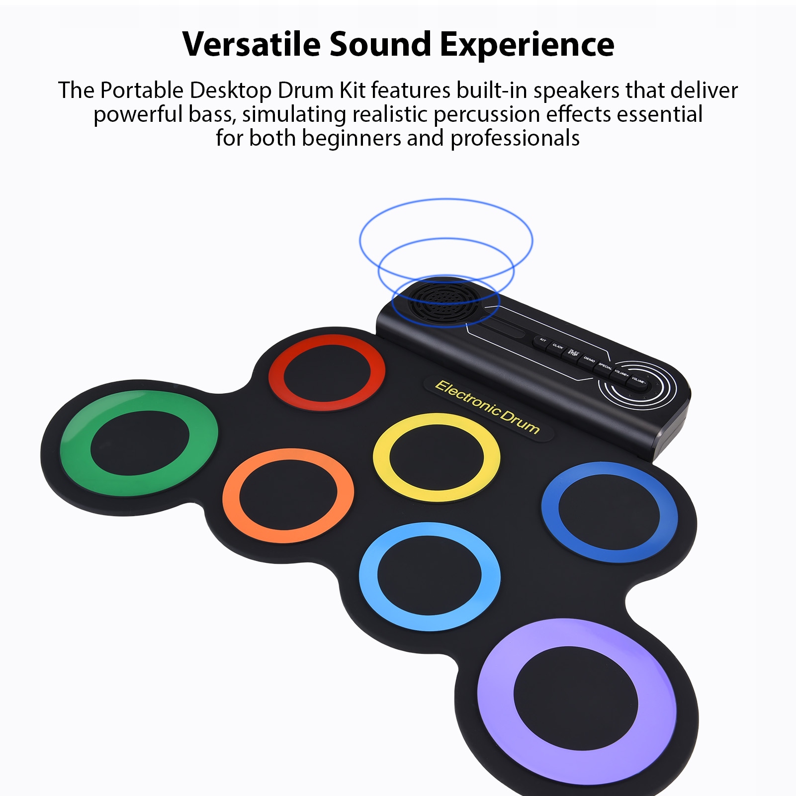 1. Универсальное звучание: портативная компьютерная ударная установка оснащена встроенными динамиками, которые воспроизводят мощные басы и имитируют реалистичные барабанные эффекты, необходимые как новичкам, так и профессионалам. Наслаждайтесь широким спектром звуков с нашей электронной ударной установкой с педалями для стилей поп, рок, латиноамериканской и электронной музыки.