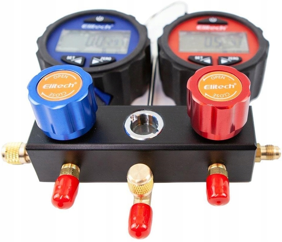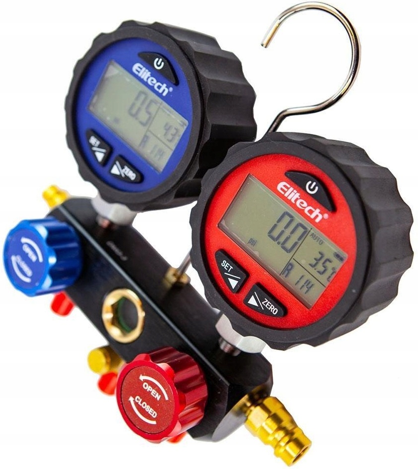 Электронные манометры повышают комфорт и точность подачи хладагента в систему. Поддерживает не менее 87 различных хладагентов: R134A, R1234yf, R600, R600A, R601, R601A.
