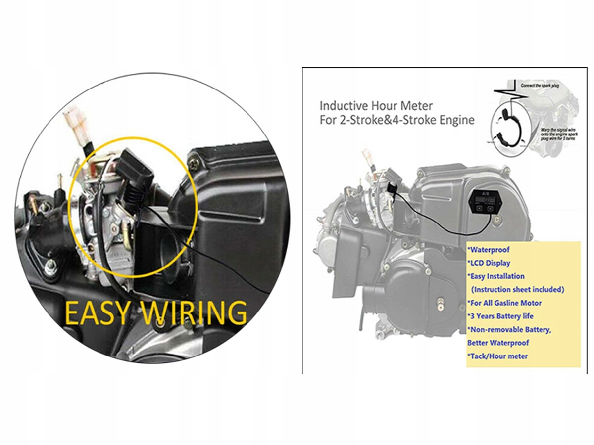 Небольшой счетчик времени работы двигателя внутреннего сгорания позволяет точно контролировать износ двигателя и других компонентов таких устройств, как мотоциклы, скутеры, газонокосилки внутреннего сгорания, генераторы, квадроциклы и многие другие. Универсальная конструкция делает его пригодным для использования во всех бензиновых двигателях, как двух-, так и четырехпоршневых.