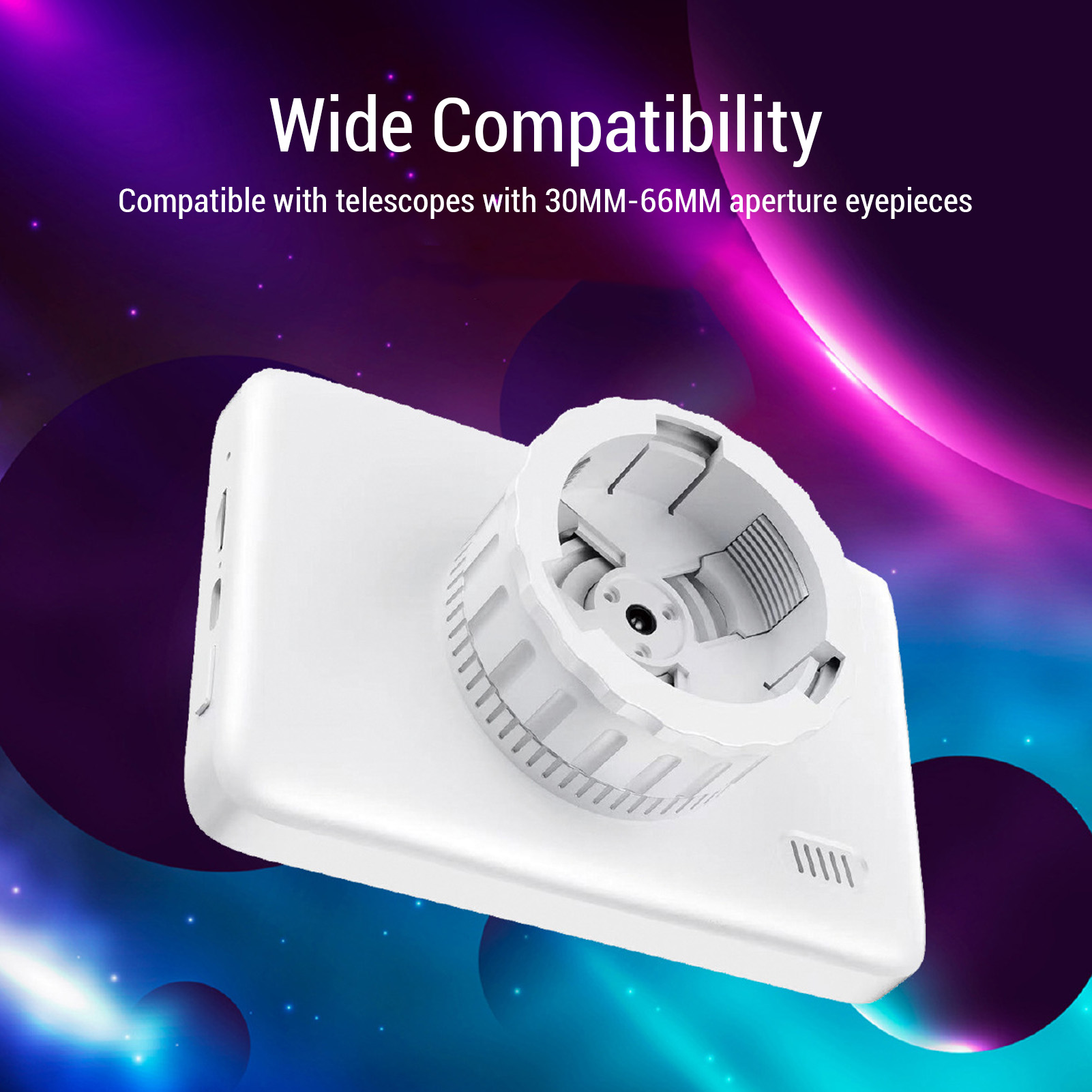 3. Простая установка: этот электронный окуляр совместим с телескопами с диаметром окуляра 30–66 мм и прост в установке. Просто открутите подвижный байонет, прикрепите устройство к телескопу и надежно затяните байонет для стабильной установки.