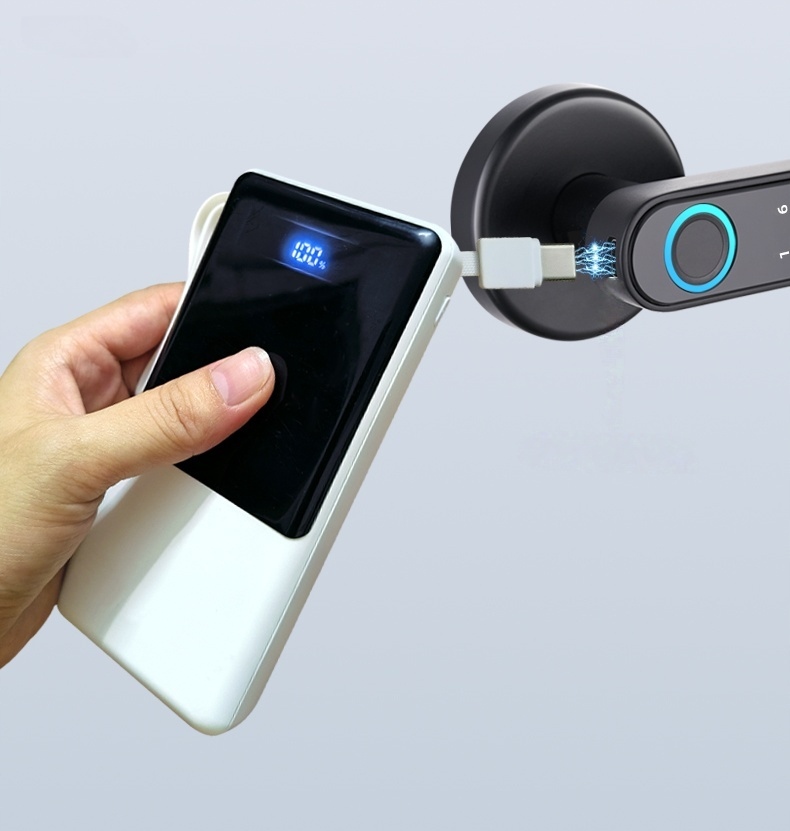 Когда батарея дверного замка разряжается, подключите переднюю ручку к портативному зарядному устройству, чтобы разблокировать дверь обычным способом с помощью отпечатка пальца или Lu.