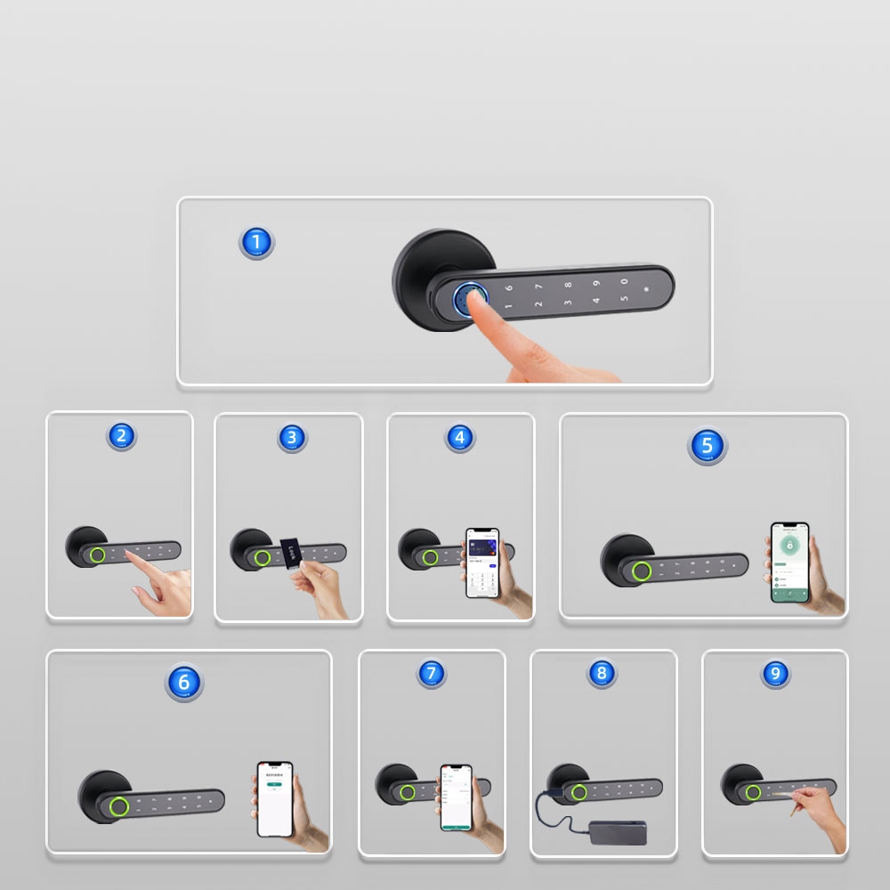 Способы разблокировки — отпечаток пальца, код доступа, ключ, функция постоянного открытия, приложение Tuya, NFC, временный доступ код