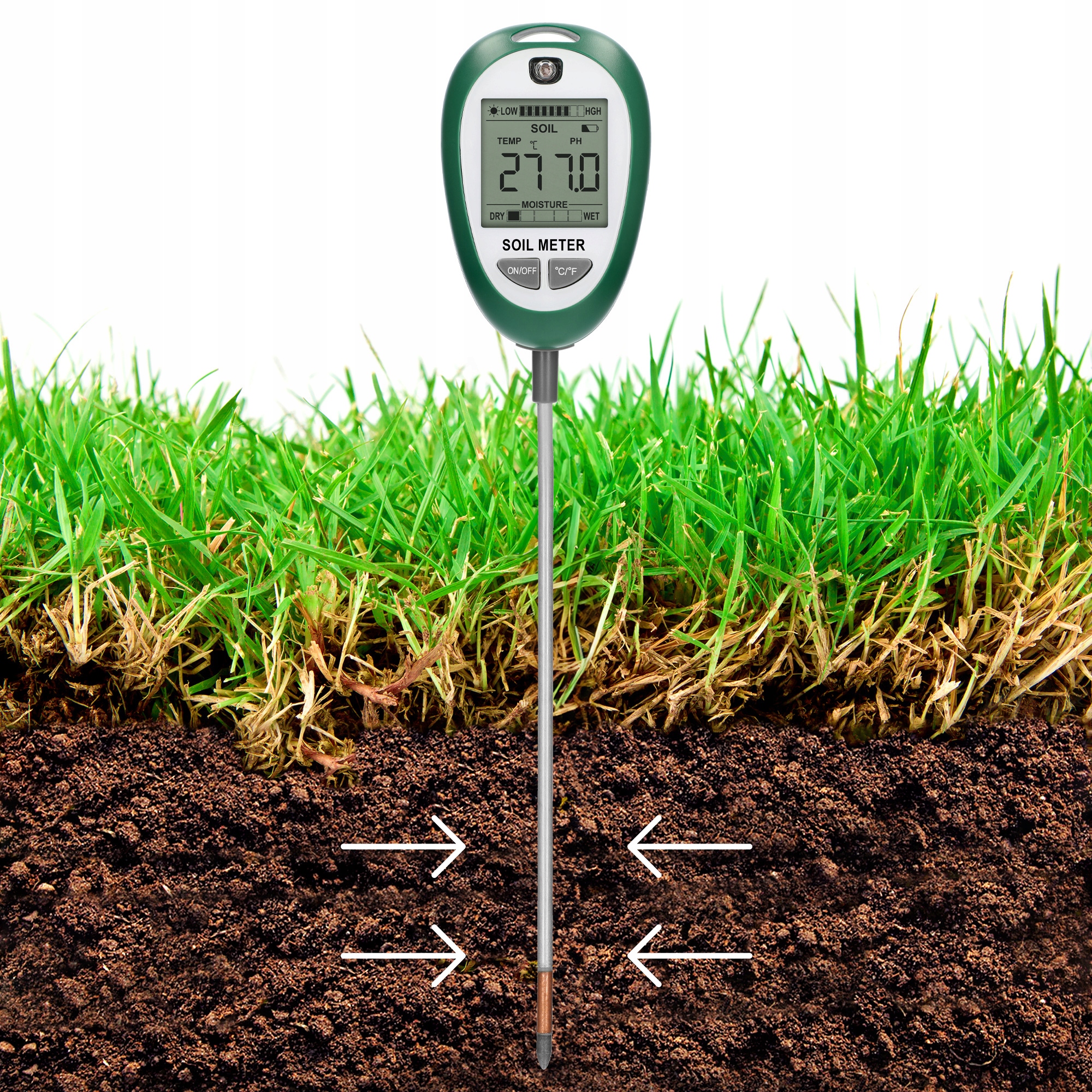 благодаря нашему устройству быстро и простым способом вы изучите все вышеперечисленные параметры почвы как на вашем участке, в домашнем саду, теплице, балконе и в горшках с домашними цветами! Наш тестер также будет работать во время ухода за газоном!