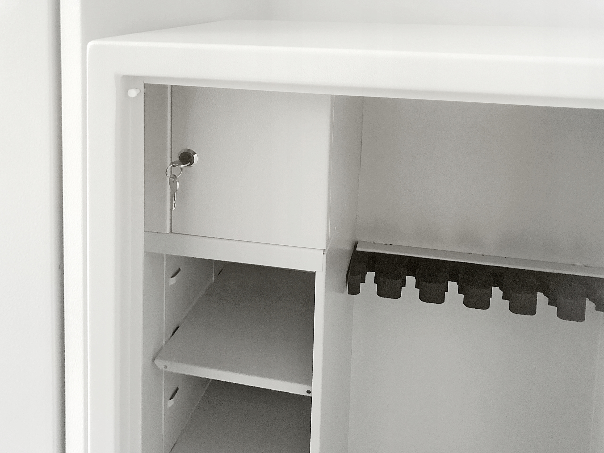 Кроме того, сейф разделен на два отсека. Один из них оснащен 6 пенопластовыми держателями для длинноствольного оружия. Во втором — 2 полки и сундук с сокровищами, запирающийся на отдельный ключ. Дно обложено ковролином.