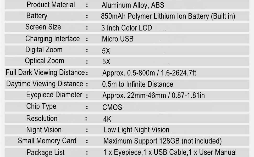 Долгий срок службы: этот электронный окуляр оснащен встроенным полимерным литий-ионным аккумулятором емкостью 850 мАч, который обеспечивает длительный срок службы и может поддерживать непрерывную работу в течение 4 часов. Он оснащен USB-интерфейсом для зарядки, поэтому его можно заряжать с помощью блока питания или зарядного устройства для телефона.