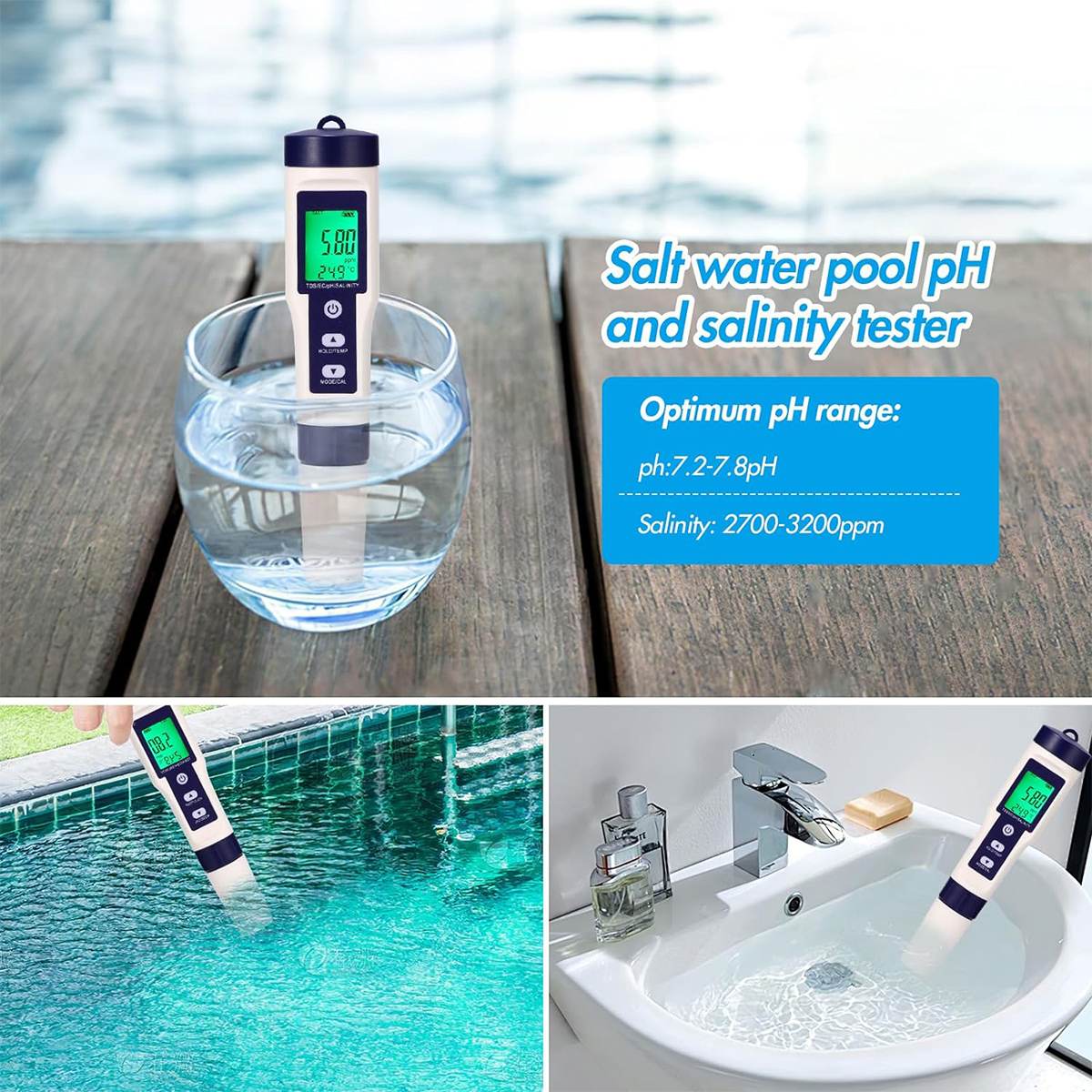 【Многофункциональный pH-метр】 Интеллектуальный pH-метр 5-в-1 с ЖК-дисплеем с зеленой подсветкой. Автоматическая температурная компенсация в диапазоне 0–60°C позволяет избежать неточностей измерений, вызванных изменениями температуры жидкости. Комплексное измерение качества воды для обеспечения ее здоровья.