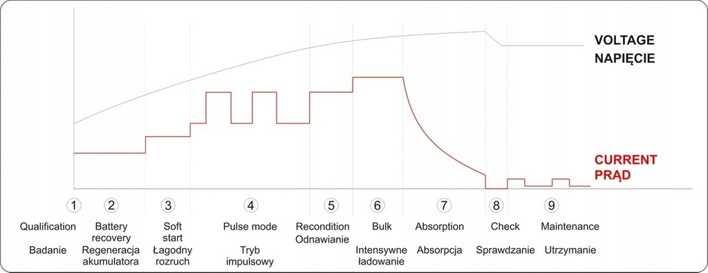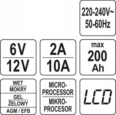 Профессиональное устройство для зарядки аккумуляторов напряжением 6 В и 12 В в мотоциклах, легковых автомобилях и микроавтобусах, сельскохозяйственных тракторах и моторных лодках. Он позволяет загружать так называемые жидкие аккумуляторы, гелевые аккумуляторы, AGM и EFB.