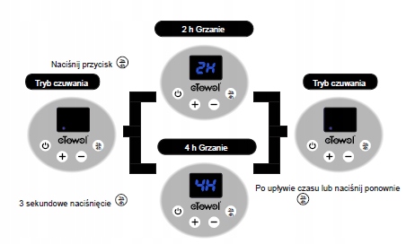 - Режим ожидания: Нагревательный элемент не работает, но встроенный защита от замерзания обеспечивает автоматическое включение нагревательного элемента, когда температура падает до 7 ℃ или ниже.