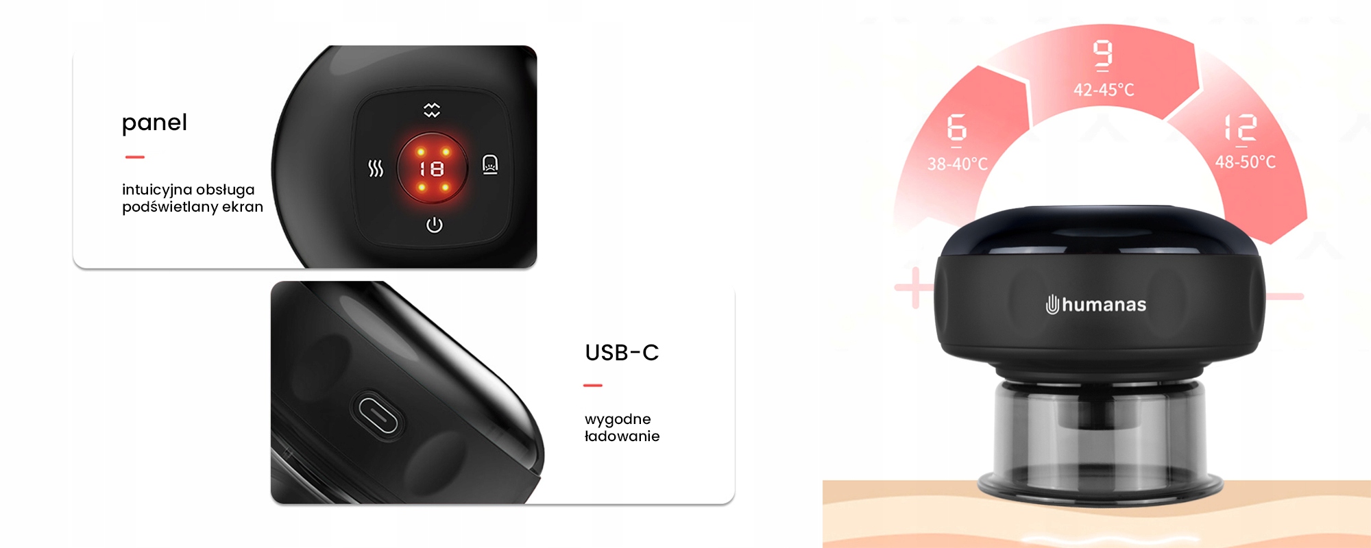 Китайская электронная чашка Humanas BB01 имеет 12-ступенчатую регулировку температуры. Устройство можно нагревать до 50°C. Использование банок в качестве горячего компресса поможет лучше воздействовать на мышцы и ткани, ускоряя кровоток и расслабляя напряженные мышцы. Тепловая терапия также поможет облегчить боль. Регулировка температуры позволяет индивидуально настроить лампу в соответствии с потребностями и предпочтениями пользователя. Это сделает ежедневные процедуры еще приятнее.