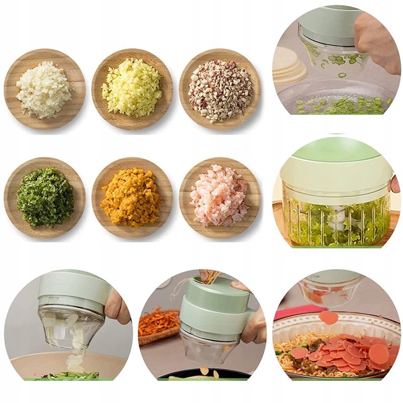 - В комплект входит: устройство, коробка, чехол для устройства, крышка для слайсера, нож для очистки и прижима в одном, слайсер, измельчитель, лопаточка, кабель USB Type-C, руководство пользователя на английском польском языке. (pdf).