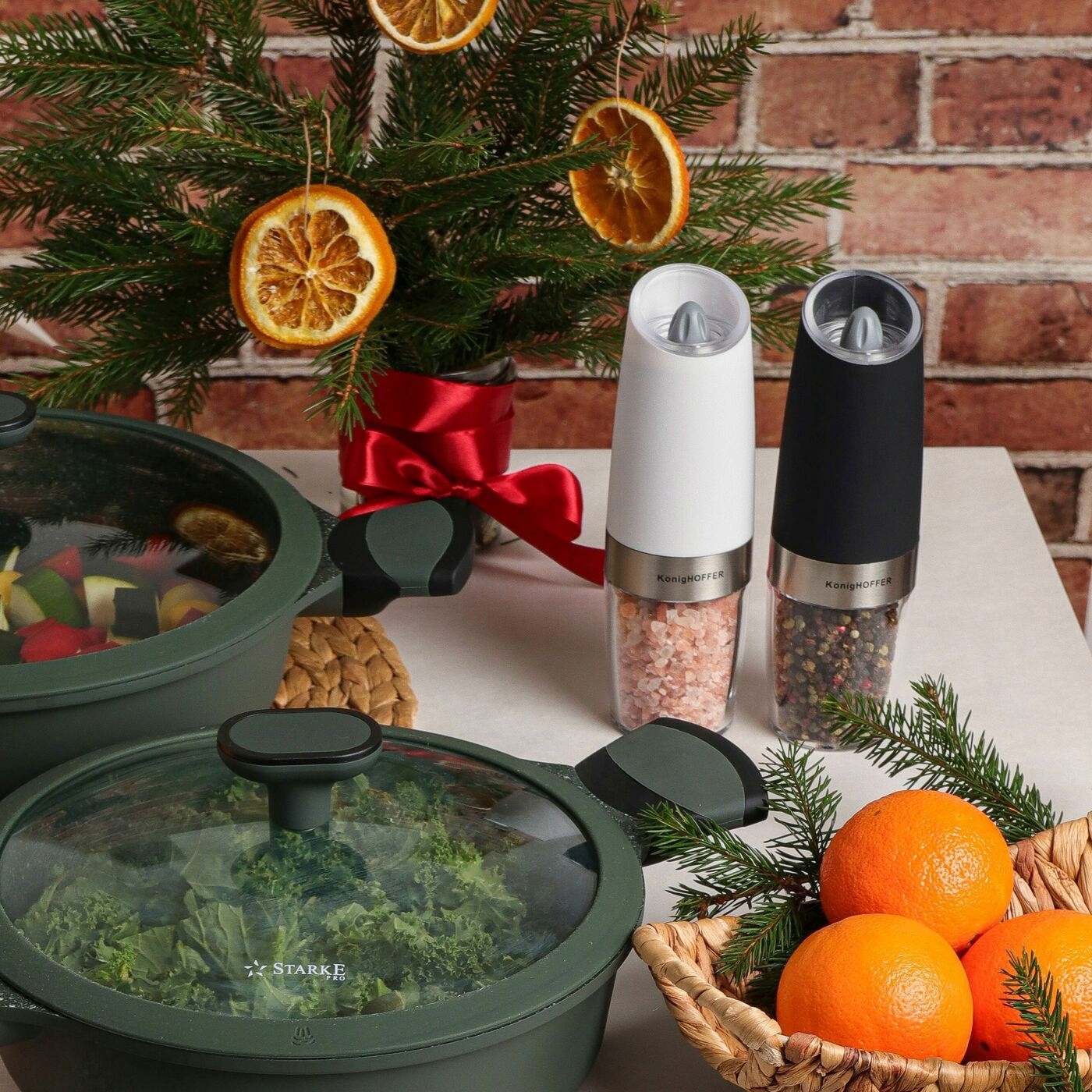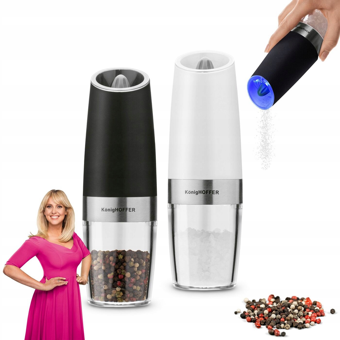 Электргравитационные мельницы Konighoffer Luca белые и черные позволяют за короткое время получить необходимое количество специй. Также набор позволяет точно отмерять молотый перец и соль, а также возможность пользоваться одной рукой. Их конструкция сочетает в себе элементы из пластика и прочной нержавеющей стали. Измельчители оснащены гравитационной системой включения механизма измельчения с электроприводом, работающим от аккумуляторов. Просто переверните их прозрачным контейнером приправой вверх, и они начнут работать. Вы можете легко проверить количество соли или перца внутри и спланировать покупку, чтобы пополнить их запас. У них также есть подсветка области, которую вы приправляете, чтобы облегчить дозировку. Модели питаются от батареек ААА напряжением 1,5 В – они не входят в комплект и приобретаются отдельно. Продукт рекомендует Ева Вахович. Как амбассадор бренда Konighoffer, она горячо и с улыбкой рекомендует его для домашнего использования. Вместе с ним вы получите свой рецепт для дома. Это один из лучших вариантов в этой категории!