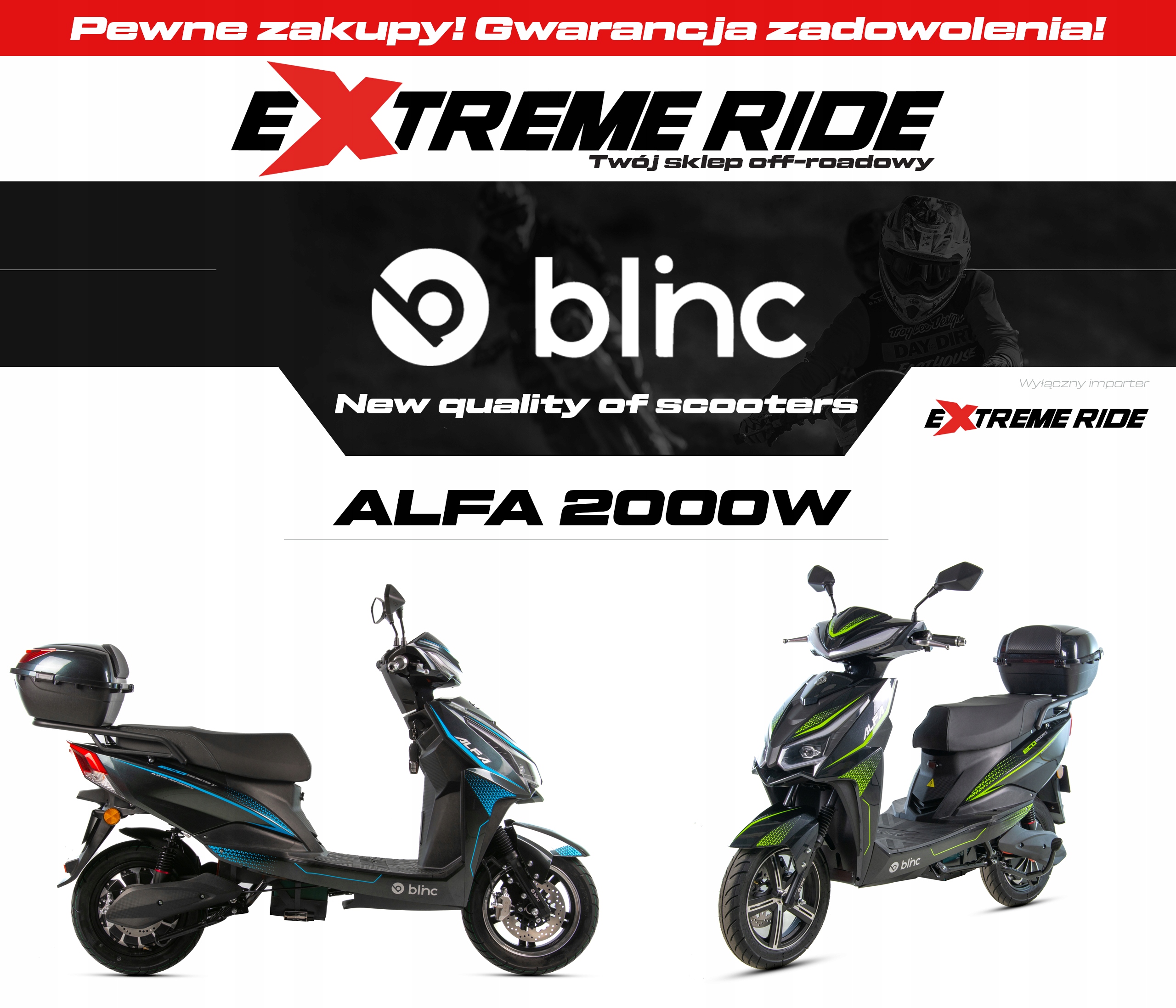 BLINC ALFA — новейшая линейка электросамокатов на польском рынке. Удобство использования скрыто в красивой форме. Самокат оснащен электродвигателем мощностью 2000 Вт. Он питается от комплекта батарей 72 В, 20 Ач. Он установлен на 12-дюймовых колесах. В стандартное оснащение входит задний багажный отсек и вещевой отсек под сиденьем.