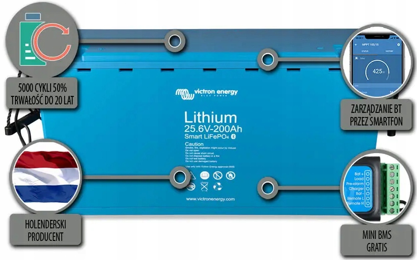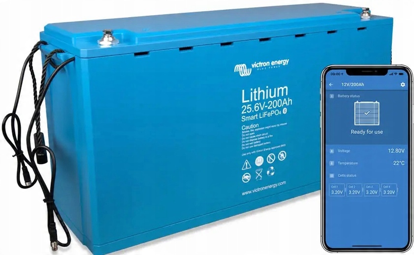 Аккумулятор LiFePO4 должен работать с устройство BMS, управляющее зарядкой аккумулятора и балансирующее напряжение 4-го элемента, что крайне важно. Для аккумулятора LiFePO4 с помощью приложения Victron Connect и соединения Bluetooth мы можем контролировать напряжение аккумулятора, ячейку и температуру без необходимости использования каких-либо измерительных устройств.