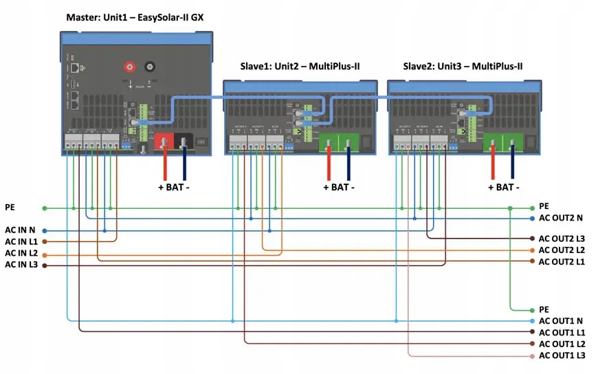 Предлагаемая система предназначена для трехфазной работы. В комплект входит главный инвертор MultiPlus GX, управляющий всей системой, и два инвертора MultiPlus II в качестве ведомых устройств.