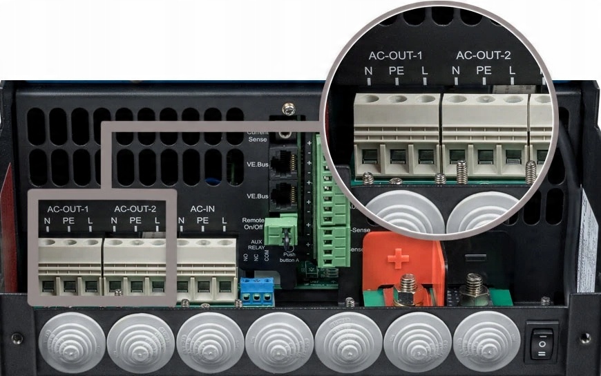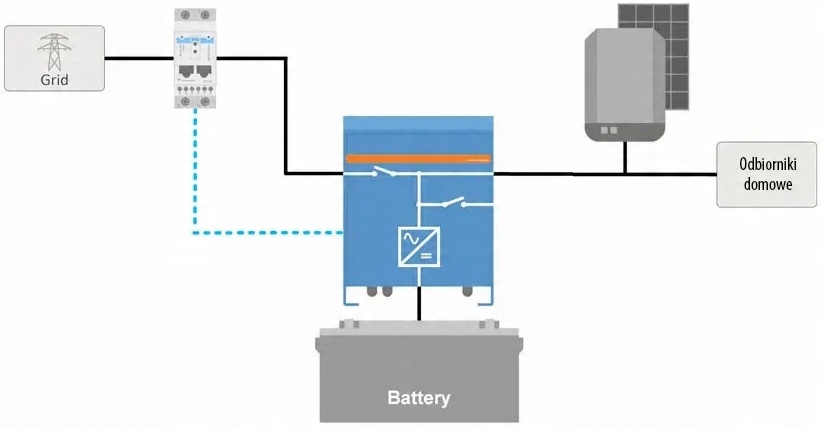 А более крупные устройства, подключенные к выходу переменного тока Out 2, работают по несколько иному принципу. Если мощность инвертора накопителя энергии составляет 2400 Вт, а наш приемник потребляет 4000 Вт, система будет потреблять 2400 Вт от батарей, а остальное — от сети. Конечно, речь идет о ситуации, когда другой энергии нет. Каждый инвертор MultiPlus имеет так называемый резервный переключатель, на котором указана мощность в амперах. Если реле имеет ток 32 Ампера, а инвертор - 3000ВА, это означает, что с выхода AC Out 2 можно снять в общей сложности 32А * 230В + 3000Ва, общая мощность инвертора составит 7360Ва + 3000Ва = 10360Ва, то есть около 9000Вт, потому что реактивная мощность Va на самом деле ниже активной мощности, выраженной в ваттах.