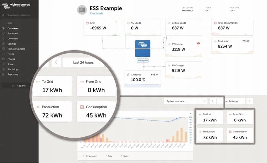 Благодаря онлайн-мониторингу с помощью браузера можно проверить текущее состояние устройства, а также исторические данные, даже многие много лет назад. Портал VRM также предоставляет удаленную консоль, с помощью которой можно настроить энергохранилище или выполнить обновление. Ни одна другая система не предоставляет такой свободы работы и доступа к информации в такой простой форме. При необходимости можно управлять несколькими накопителями энергии с помощью одной учетной записи VRM.