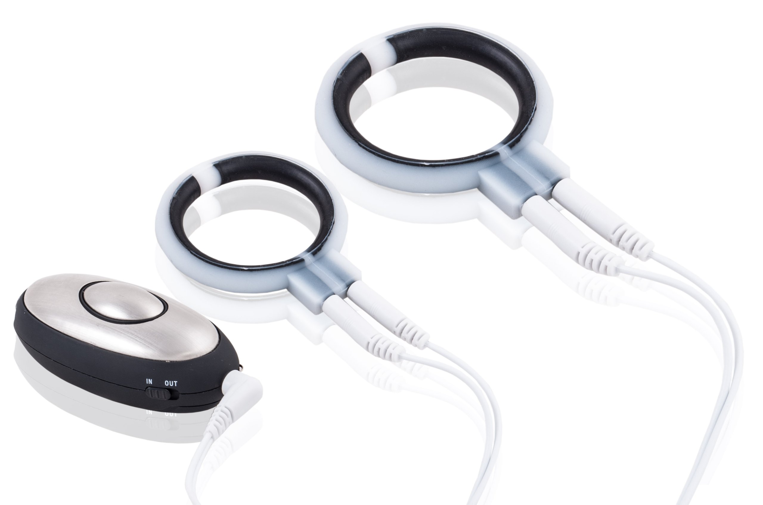 В комплект входят 2 кольца и пульт дистанционного управления, с помощью которого можно выбирать интенсивность электрических сигналов. Дополнительно можно использовать пульт в качестве электрошокового массажера, он имеет функцию переключения стимуляции с кольца на себя. Поэтому в набор входят 2 игрушки, эффектные кольца для пениса и эротический массажер для интимных мест для Нее. Помимо функции массажера, пульт дистанционного управления позволяет контролировать мощность электрических импульсов и их частоту.