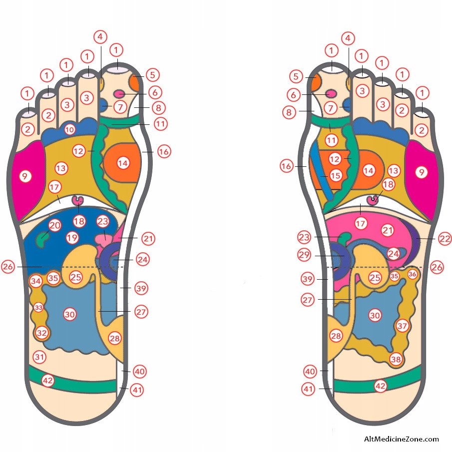 Согласно теории рефлексотерапии, нервы проходят через тело и заканчиваются в пальцах рук и ног. Каждый из этих нервных путей называется зона (зона). Таким образом, путем стимуляции соответствующих нервных окончаний стоп воздействуют на отдаленные части тела, соответствующие этим окончаниям.