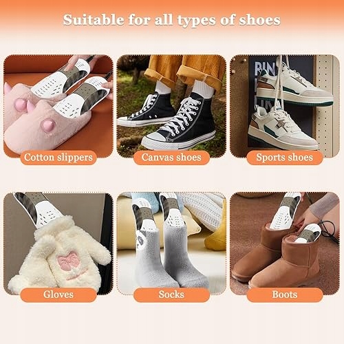 Широкий спектр применения: электрическая сушилка для обуви быстро высушит мокрую обувь, подходит для хлопчатобумажных кроссовок, кожаной обуви, парусиновой обуви, рабочей обуви, зимних ботинок и спортивной обуви.