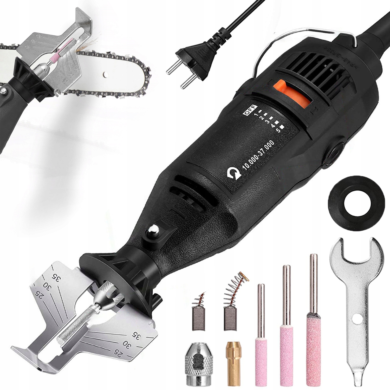 – Бензопилы со временем затупляются, теряют производительность и изнашиваются, наша точилка для цепей имеет 5 скоростей, регулируемых в диапазоне 10000–37000 об/мин.