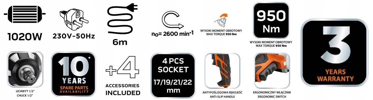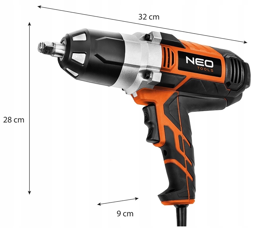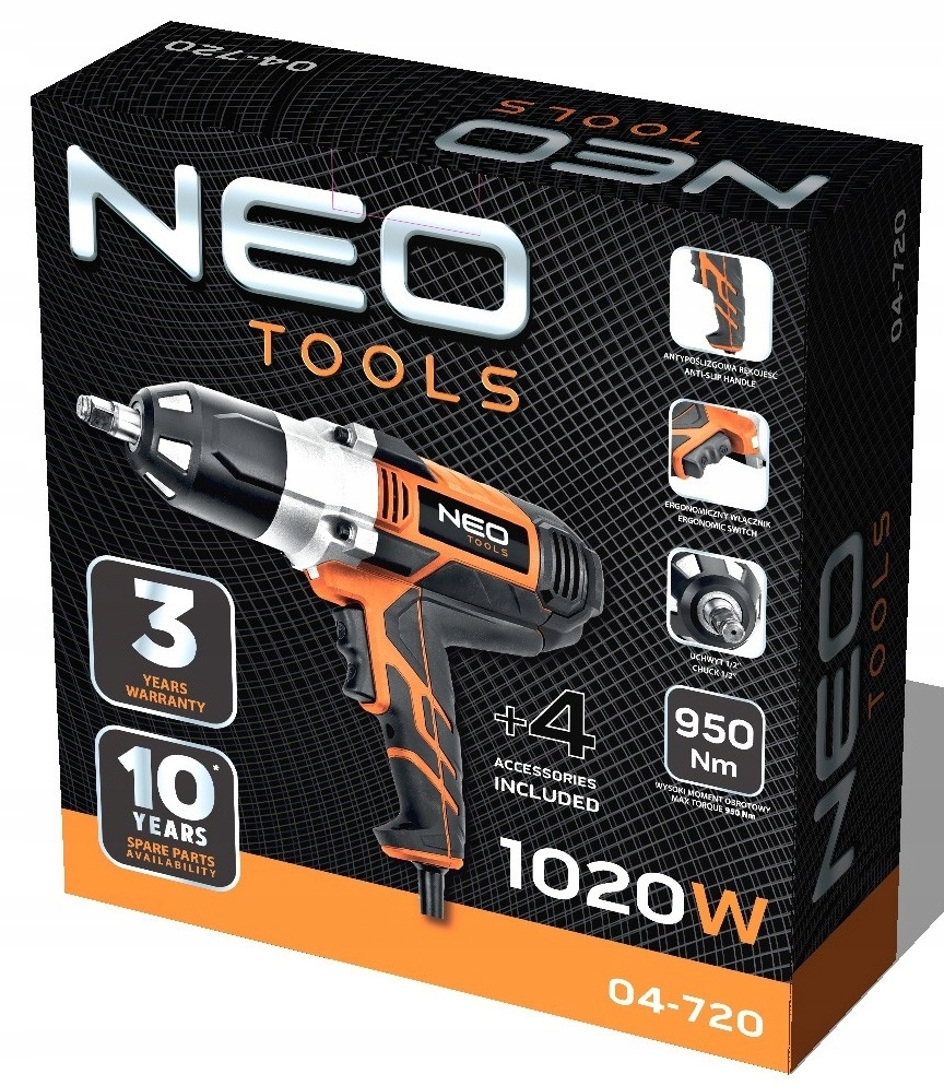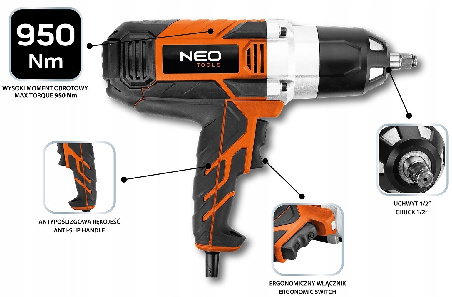 Электрический ударный гайковерт мощностью 1020 Вт от марки NEO, который характеризуется высокой скоростью вращения до 2600 об/мин и максимальным крутящим моментом 950 Нм. Он допускает вращение как вправо, так и влево. Он достигает крутящего момента 950 Нм при отвинчивании и 700 Нм при затягивании. Оснащен квадратным держателем инструмента с параметром ½", позволяет осуществлять монтаж с наиболее популярными типами ударных головок.