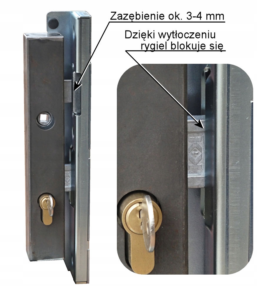 Кассета имеет тиснение, позволяющее закрыть ворота на ключ при использовании узкого замка, например 90/22 Jania, 90/20 KOWAL, 72/34 Jania или 72/34 Metalplast и т. д.