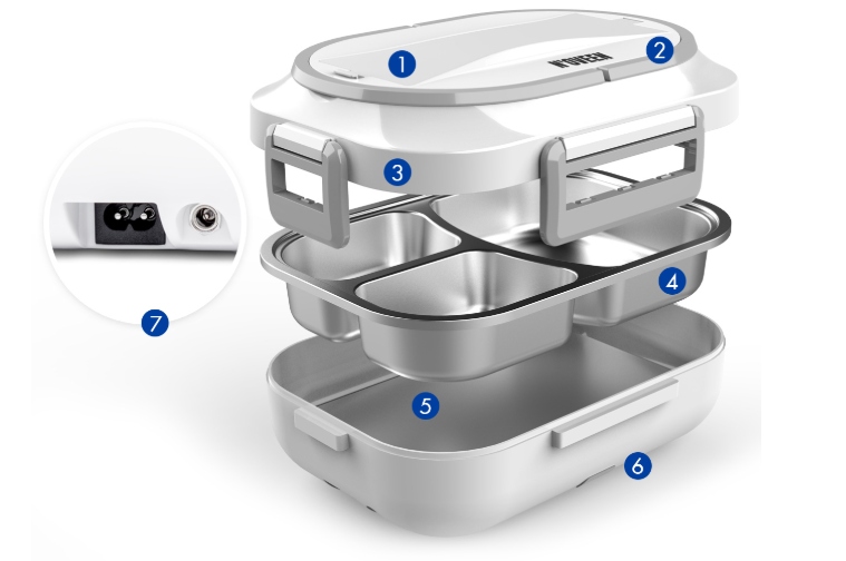 Прибор оснащен ТЭНом PTC, позволяющим разогреть пищу до 60°С за 30 минут. Плотное закрытие позволяет сохранять температуру блюда.