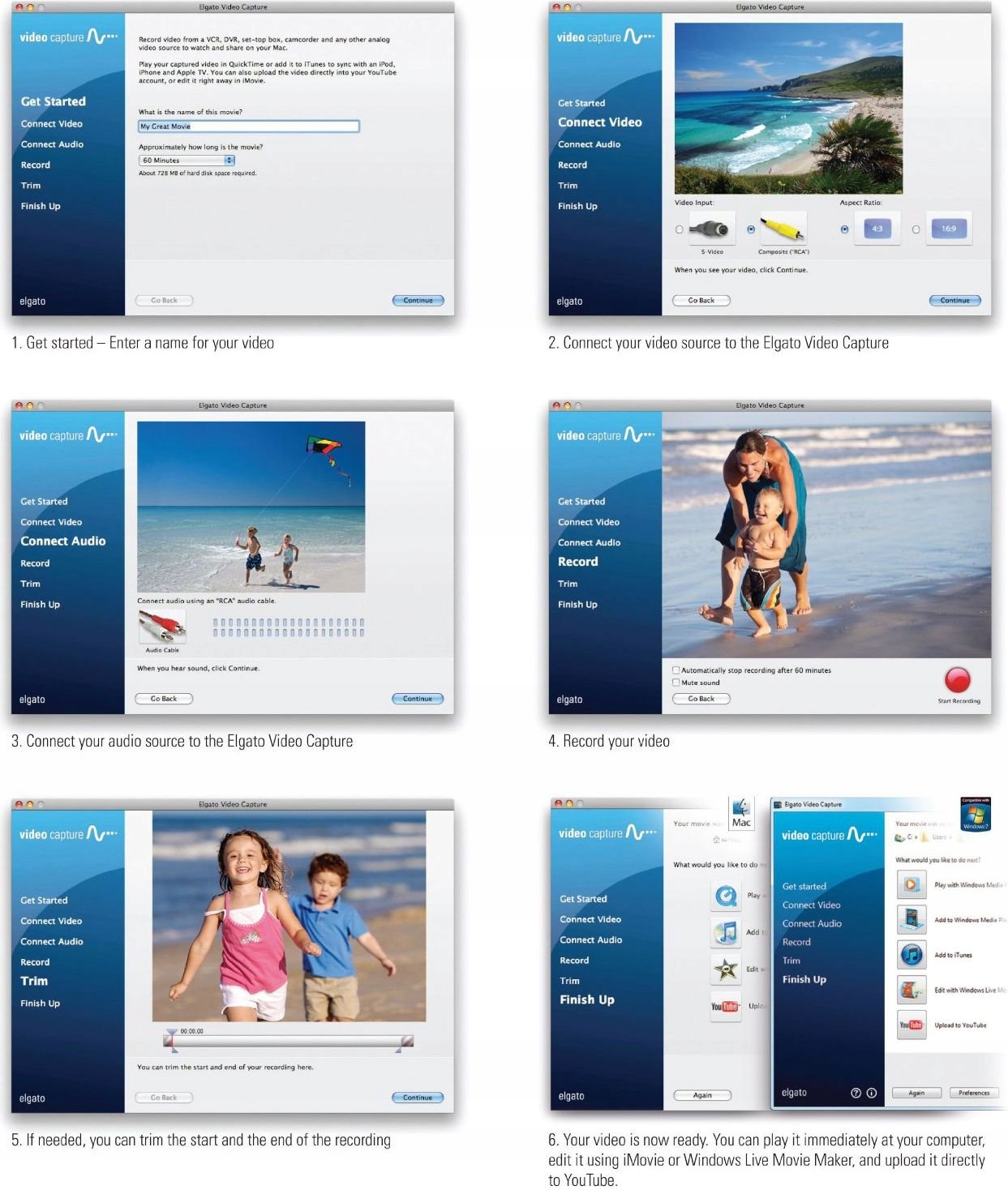 Видеокарта для захвата сигналов VHS от Elgato очень проста в установке и использовании. Пользователю предоставляется программа Elgato Capture Video и программный помощник, который шаг за шагом сопровождает пользователя с момента установки программы и подключения карты Elgato к аналоговому устройству. Программное обеспечение предоставляет вам широкий спектр возможностей выбора способа просмотра материалов и обмена ими. Достаточно всего нескольких кликов, чтобы отправить запись в iTunes или просмотреть ее на экране компьютера.