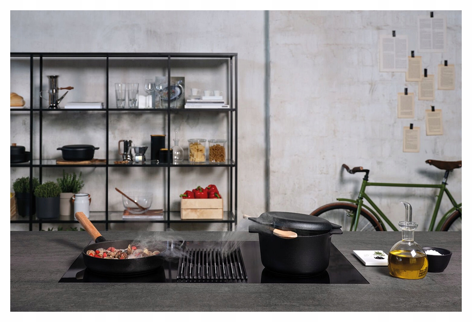 Индукционная варочная панель с вытяжкой изготовлена из черного стекла и чугуна.