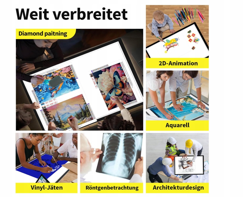 - Световой стол A1, очень большой: размеры сверхбольшого светового стола A1 составляют 90 см x 60 см (35,4 x 23,6 дюйма). Светоизлучающая поверхность имеет размеры 85 см х 55 см. Толщина всего 7 мм, поэтому его легко носить с собой. Благодаря использованию световой панели свет распределяется равномерно, а встроенные специальные светофильтры предотвращают утомление глаз. Отсутствие теней и бликов гарантирует, что ваше зрение останется неизменным даже после нескольких часов работы.