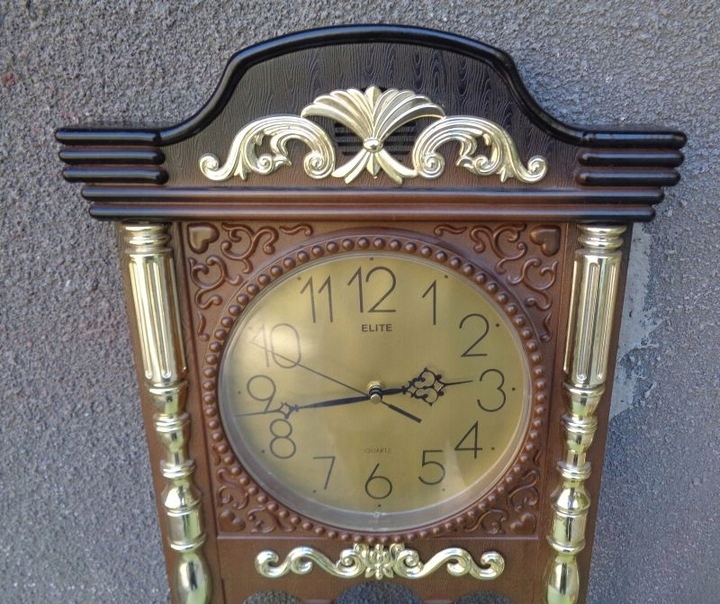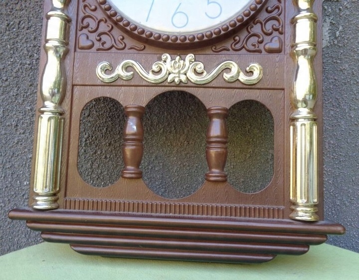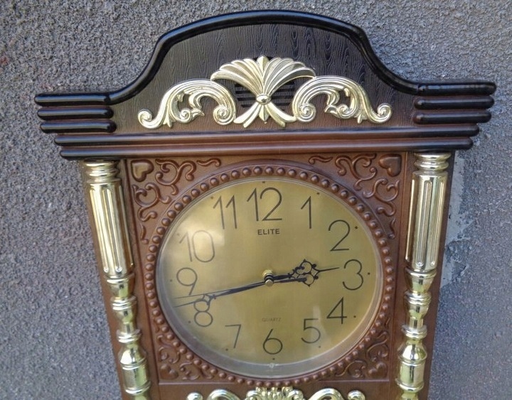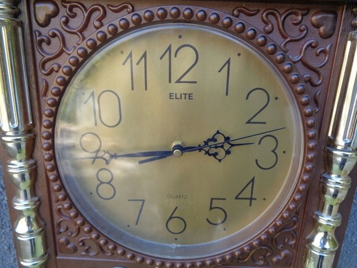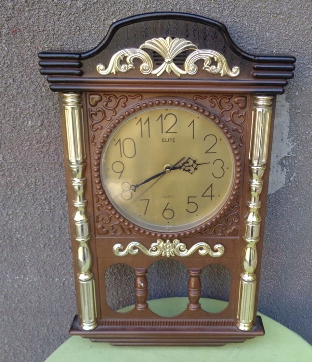 Интересные, интересные подвесные кварцевые часы от Elite. Корпус экспоната выполнен из пластика. Часы имеют богатое разнообразие орнаментов в эклектичном стиле. Орнаменты, украшающие часы, имеют форму колонн и различных розеток. Некоторые декоративные элементы имеют золотой цвет. На выставке представлен интересно оформленный неоднородный холм. Подпись часов размещена на циферблате и видна на фотографиях. Часы идут. Всем рекомендую.