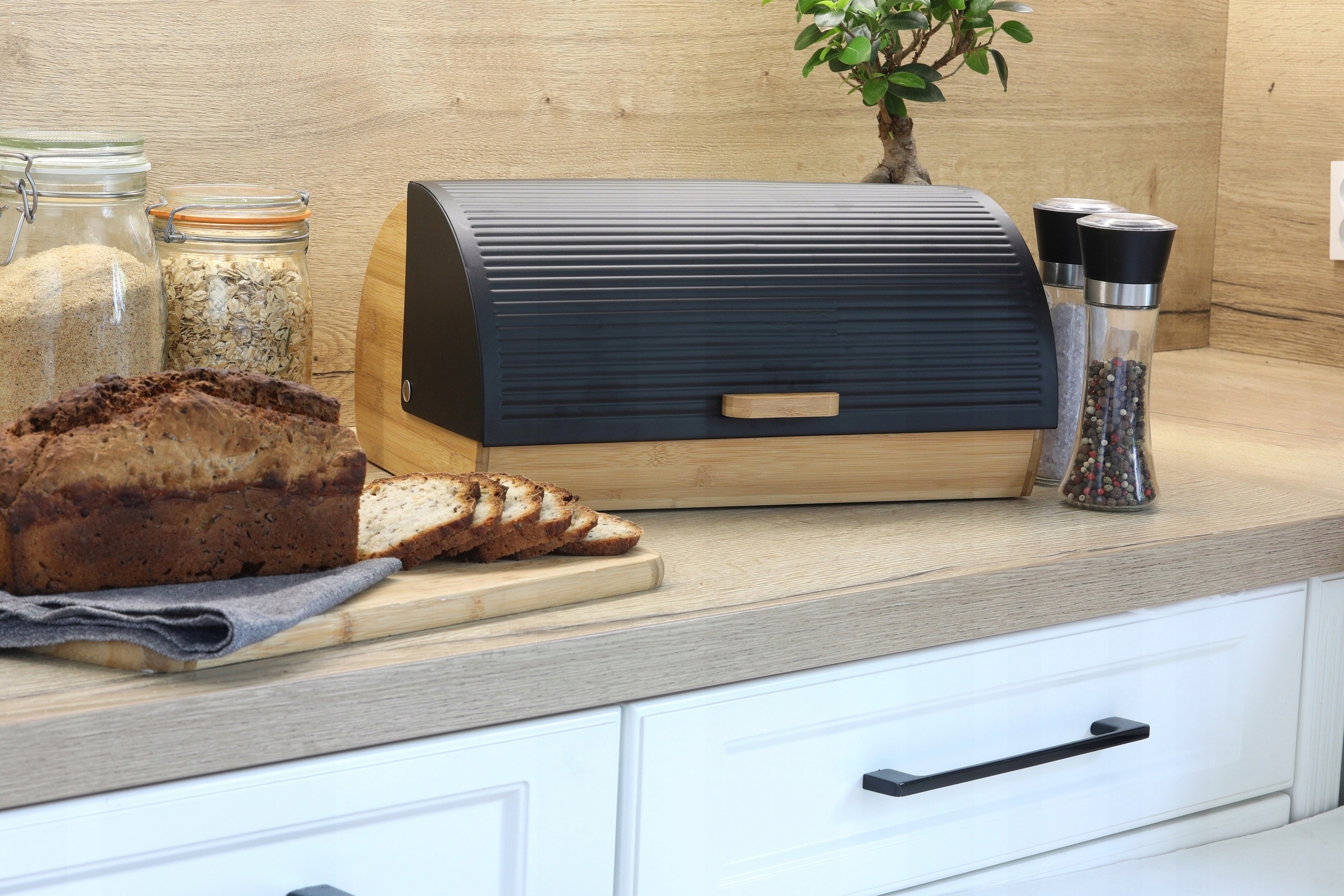 Современная форма хлеба, его эффективная форма и сочетание металла в черном цвете с бамбуком отлично смотрятся на стойке. бамбук.