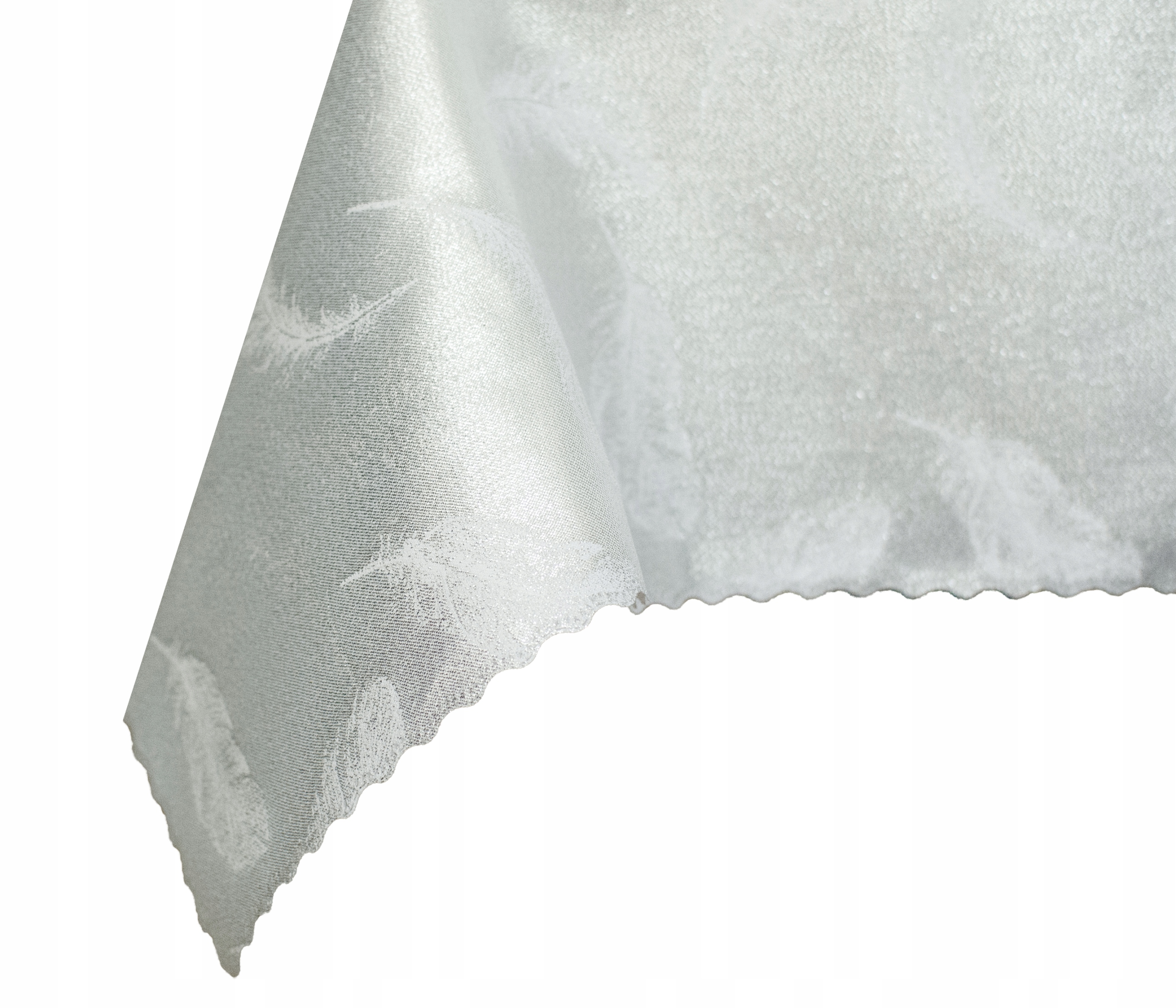 Красивая скатерть кремового цвета с блестящими серебристо-белыми перьями. Перья добавляют легкости, а металлизированный узор подчеркнет неповторимый вид стола. Скатерть двусторонняя, поэтому ее можно легко положить на левую сторону, а также она будет устойчива к пятнам.