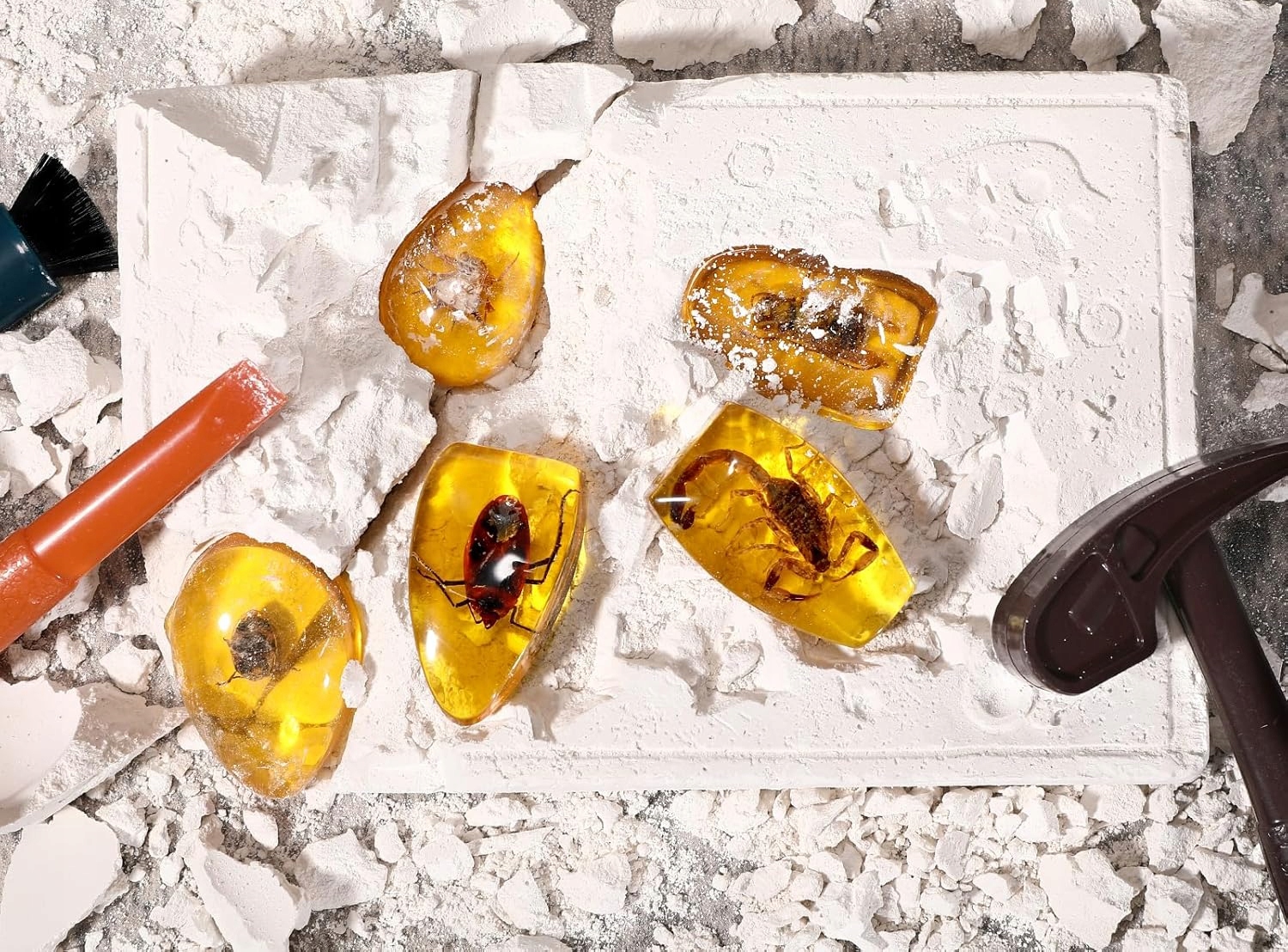 Откройте для себя увлекательный мир геологии и энтомологии! этот набор передаст вашего ребенка в мир раскопок, где он будет чувствовать себя настоящим палеонтологом, обнаруживая сокровища, спрятанные в янтаре.